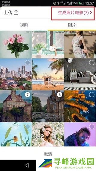 4、第四步选择要生成视频的图片,点击右上方的“生成照片电影”,需要注意的是选择照片要大于1张,如下图所示