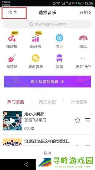 2、第二步进去选择音乐界面之后,点击左上方的“上传”;