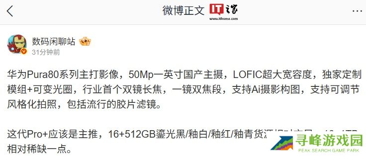 博主@数码闲聊站 今日发文透露,华为 Pura 80 系列手机主打影像,配备 50Mp 一英寸国产主摄,LOFIC 超大宽容度,独家定制模组 + 可变光圈;拥有行业首个双镜长焦,一镜双焦段;支持 AI 摄影构图、可调节风格化拍照,包括流行的胶片滤镜。
