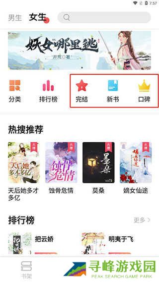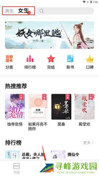 4、设有精选书库,按性别划分男女专区,并结合**度分类,根据偏好推荐好书。