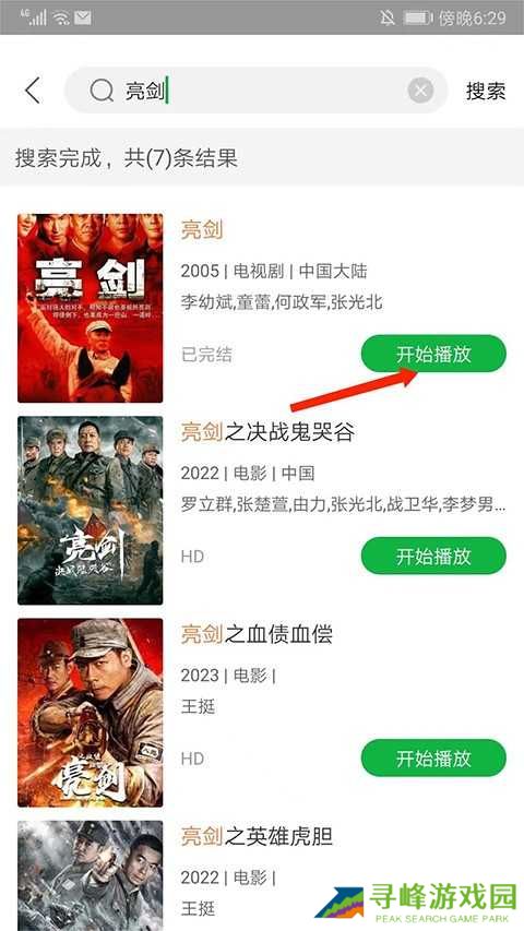4、以经典剧集《亮剑》为例,搜索后会显示相关结果,选择想看的内容点击【开始播放】;