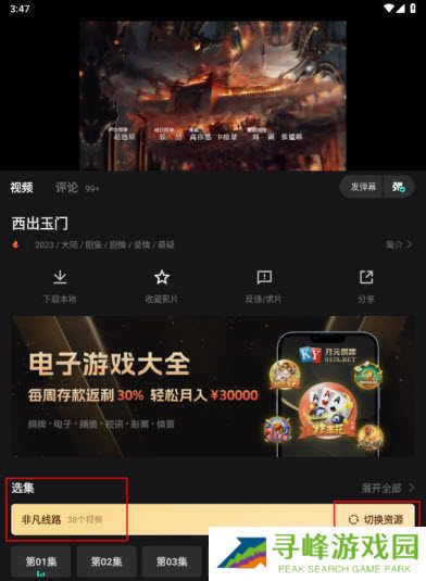 2、在播放页面下方,我们可以看到播放线路。默认的是“非凡线路”,点击右侧的切换资源来选择其他的线路