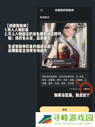 3、上传人物设定图,并填写基础外貌参数,如发色、瞳色等。例如浅灰发色、蓝色眼眸。描述越简洁,后续生成形象的自由度越高