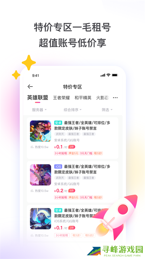 3、设置游戏账号特价专区,优质账号0.5元起租,不到一块钱也能体验大神号。