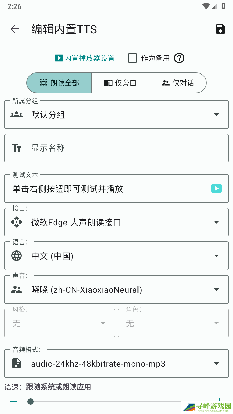 3、可以选择【朗读全部】、【仅旁白】、【进对话】,名称、分组之类可选可不选。