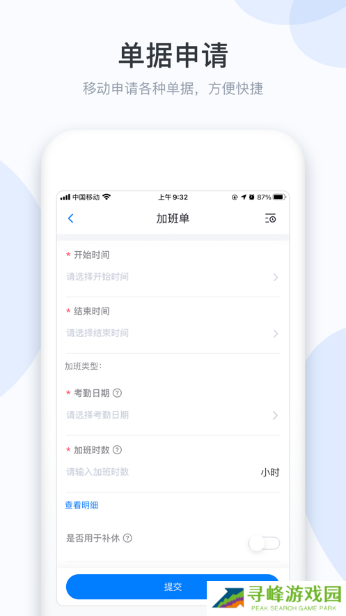 1、支持多种常用单据申请,如请假、出差、加班、销假、签卡等;