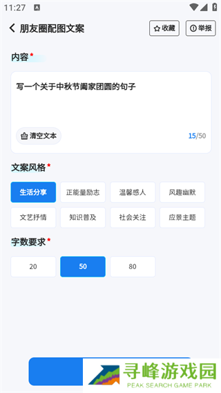 8、使用朋友圈配图文案功能,输入少量关键词或短语,即可快速生成精彩文案;