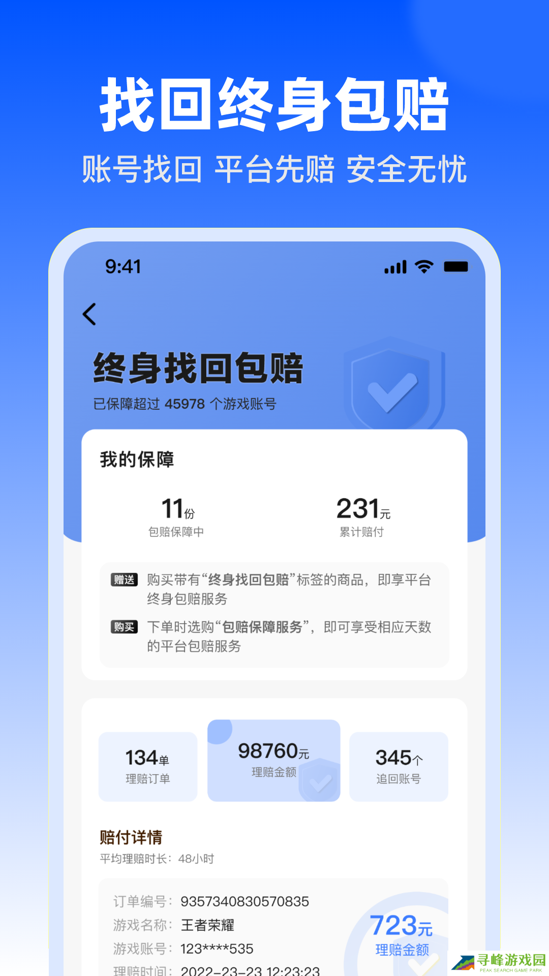 1、平台为玩家设置多重保障,账号被找回时第一时间理赔。