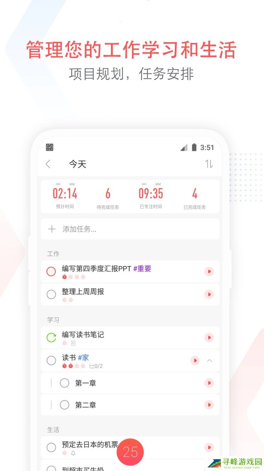 番茄任务清单是一款可以帮助你记录每天工作事宜的软件,与番茄工作法深度融合,将每天的工作时间分割为数个25分钟的时间段,期间保持对工作任务的高度专注,久而久之培养起良好的工作习惯,轻轻松松提升工作效率,从此告别拖延症。支持番茄钟在手机、电脑之间跨平台同步,无缝同步每周、每月的计划列表,工作、生活井然有序。