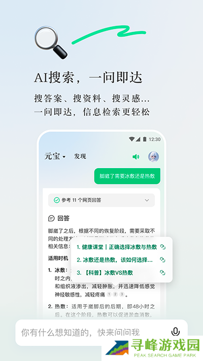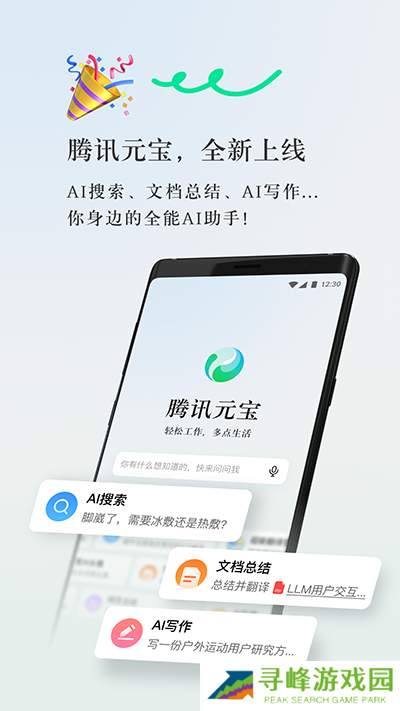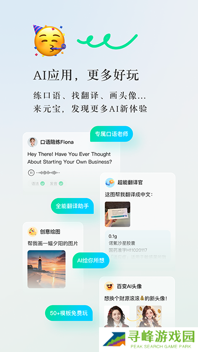 腾讯元宝是由腾讯官方所打造的一款大数据ai软件,能够在手机使用,日常生活,学习,再到办公之中都可以得到有效地提升,帮助小伙伴们有效地提高自己的工作效率。超强的ai搜索功能一问即达,搜答案,搜资料,搜灵感,搜素材,翻译语言,整理文件等等统统不在话下,一问即达,对信息的检索更加轻松,有需要的小伙伴不容错过。