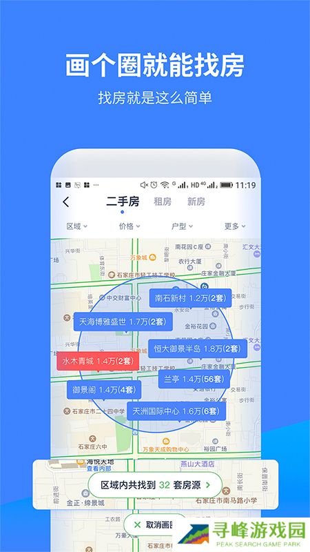 找房A加是房地产销售们必备的线上找房软件,按照客户的需求,在地图上画个圈就能筛选区域内正在出售的新房、二手房信息,价格、地段、朝向等房屋信息一网打尽,拓展公司房源储备就是这么简单。