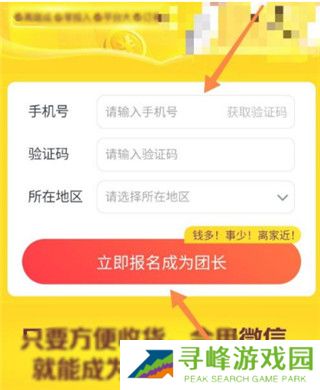 3、填写手机号码并获取验证码,选择所在地区后点击【立即报名成为团长】