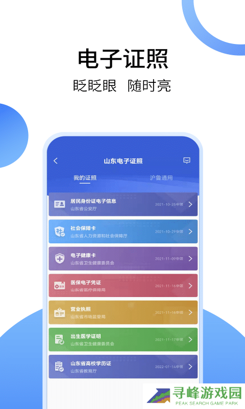 接入省级统一认证平台,提供个性化“我的”服务空间,包括电子证件申领与使用。现已上线驾驶证、身份证、出生医学证明、医护执业证等30余种电子证照,解决忘带证件带来的不便问题。
