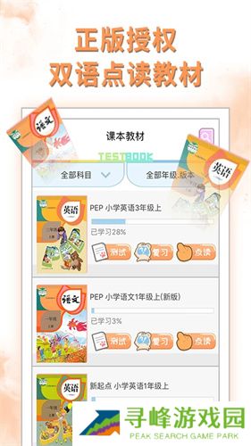 2、在手机上点读全国小学英语、小学语文课本,线上完成语音测评和练习,提高学习效率。