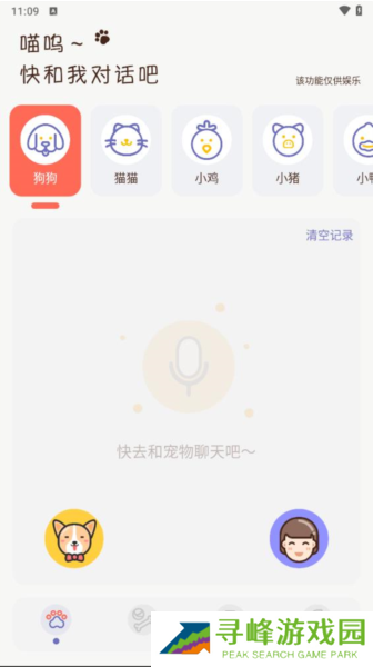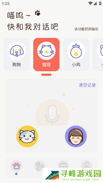 1、按住语音键,直接录制转译猫咪的叫声,即可翻译成猫狗能听懂的语言。