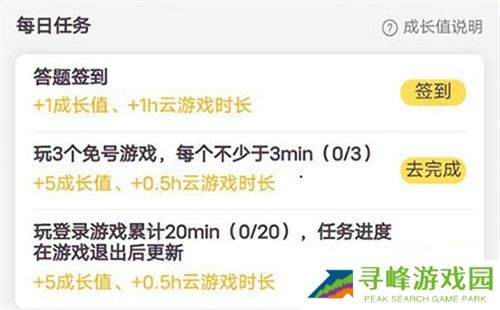 2、每日签到:通过每日签到的方式可以获取游戏时长和成长值,成功签到获取1小时游戏时长。