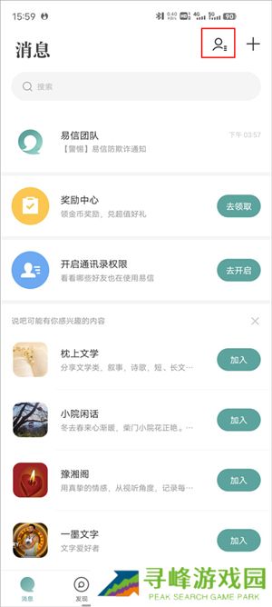 1、启动易信应用,点击底部导航栏的“消息”,随后点击顶部联系人图标;