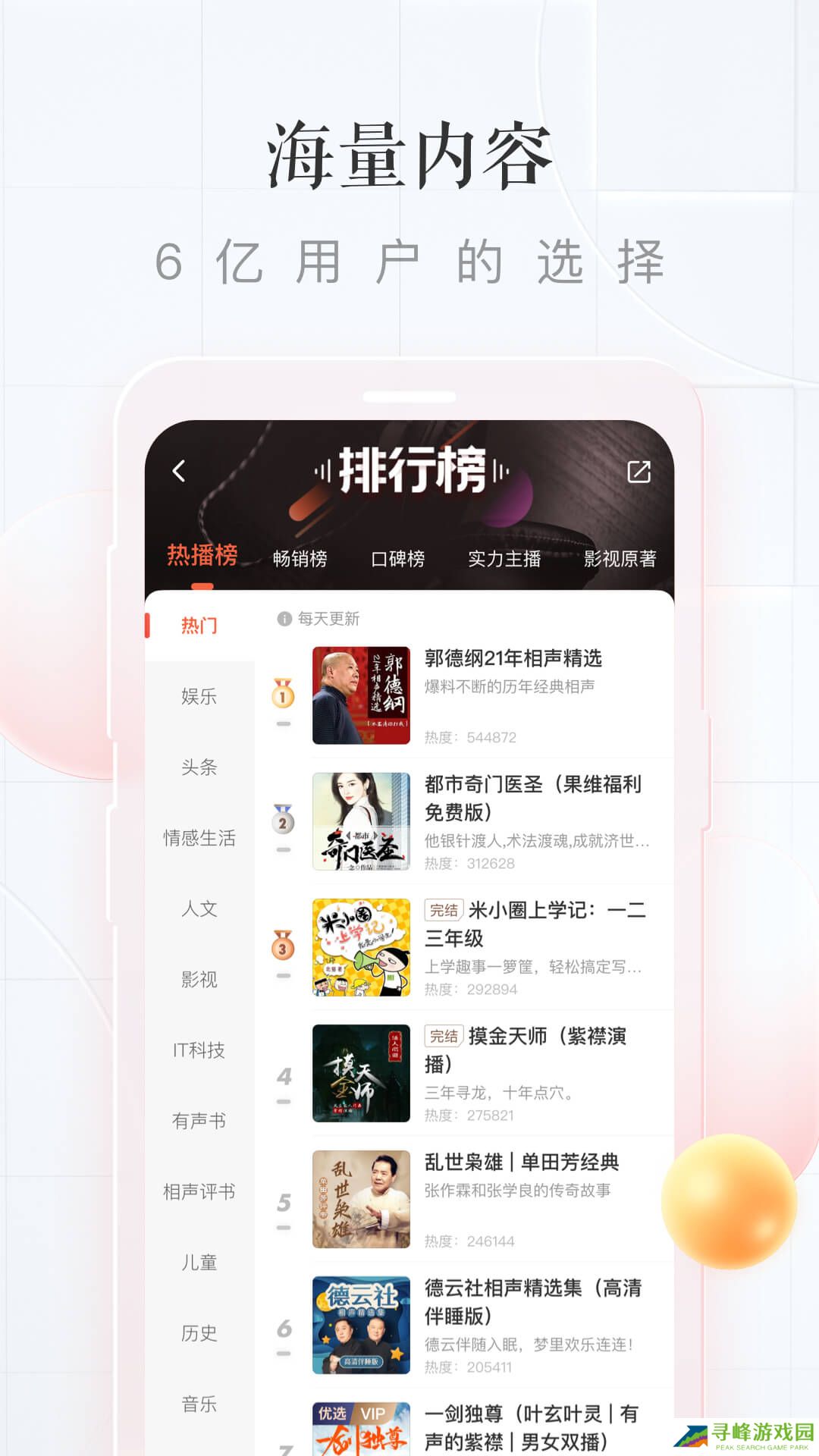 喜马拉雅免费安装包是一款以有声FM电台为主的听书软件,排队、等人、做家务没什么动力时,带上耳机让新闻与小说时刻陪伴在你身边,在碎片化的时间中用耳朵去看完一本精品小说。不知道听什么的时候不妨借助摇一摇版块让喜马拉雅为你推荐,根据每位听众的听书历史与偏好,为你展示有缘的个人电台,即刻开听,为听众们带来一点意外惊喜。