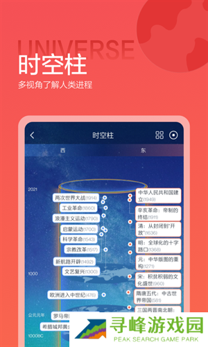 2、设置时空柱版块,吸纳关系记录了从现在超5000年的历史中,发生过的重要事项。