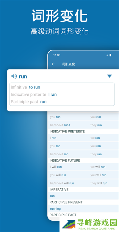 5、进入“词形变化”页面,可以更好的帮助你进行学习。