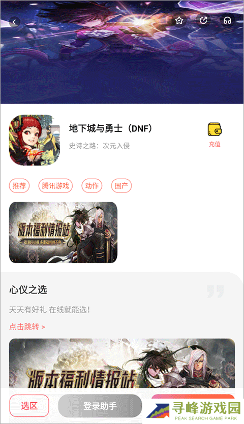 1、打开应用,在游戏大厅中搜索“地下城游戏”,进入后点击“登录助手”-“账号管理”