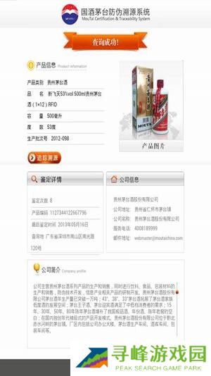 2.2、将手机正背后的NFC感应区对准茅台的RFID瓶标位置,“嘀”的一声后,停留片刻,如果查询成功则显示如下图类似页面: